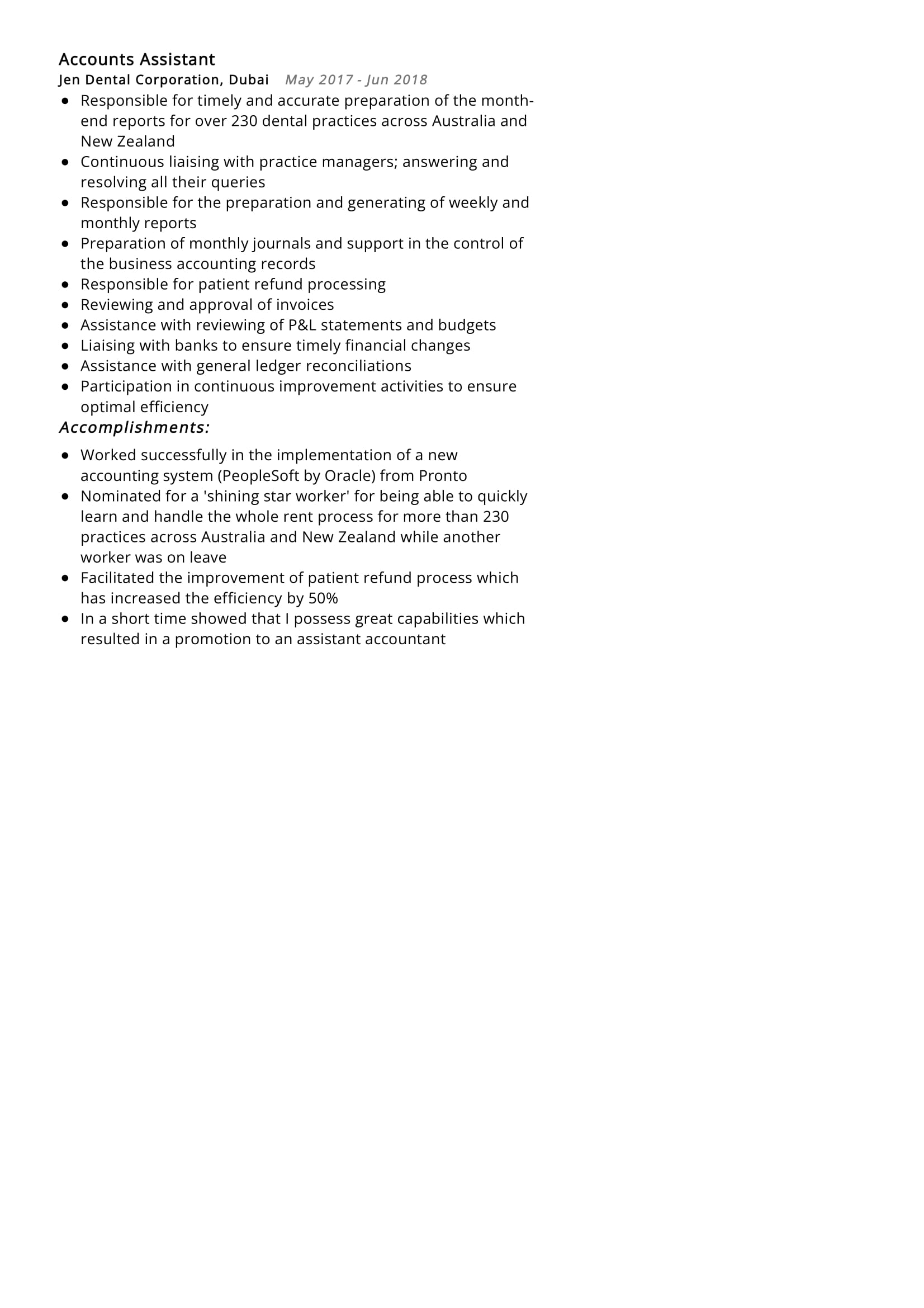 • In a short time showed that I possess great capabilities which resulted in a promotion to an assistant accountant