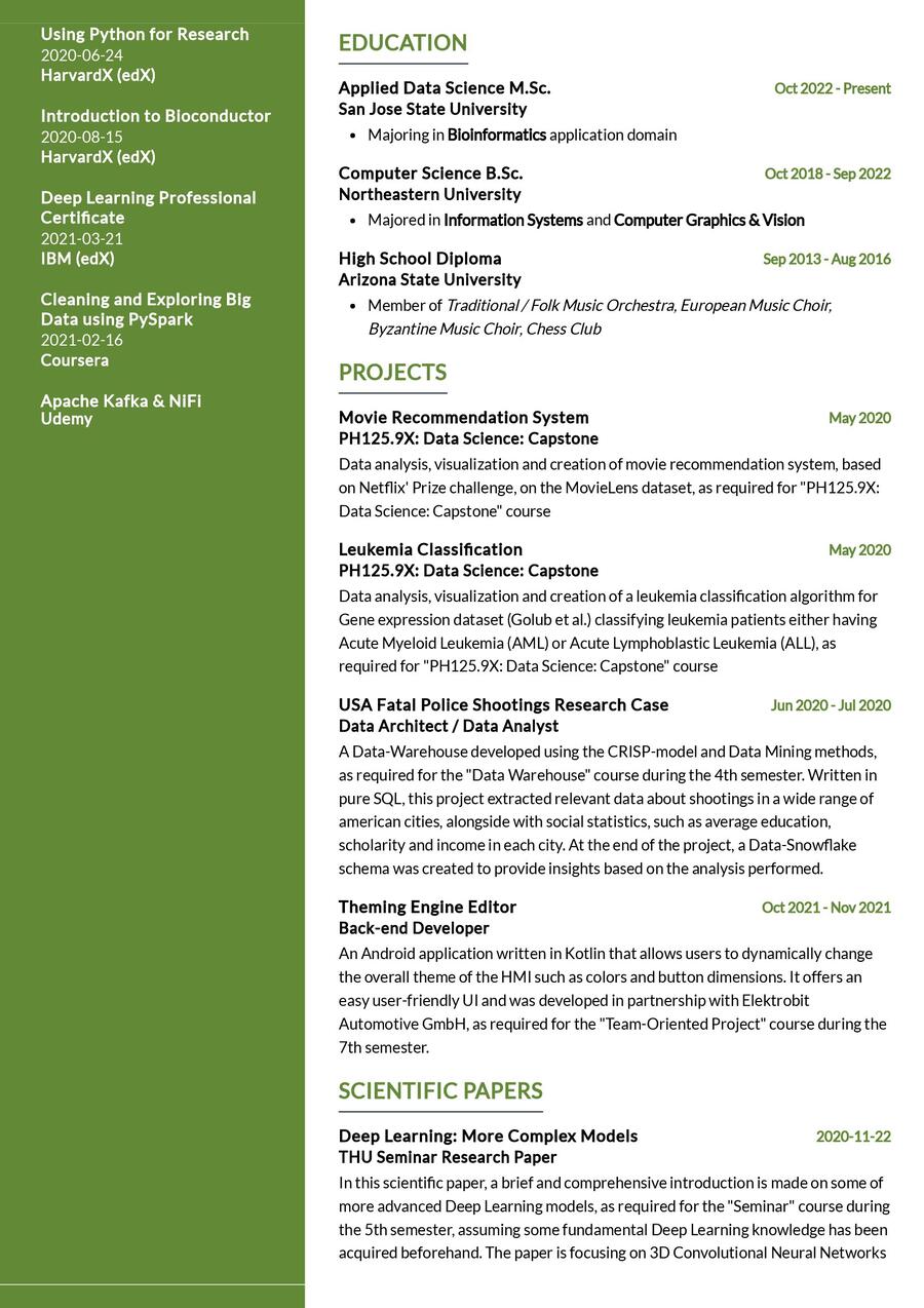 Are you a Applied Data Science by profession and looking for a career change? We have good news for you! use our job-winning professional Applied Data Science CV Example template. You don’t have to start writing from scratch. Just click “Edit CV” and modify it with your details. Update the template fonts and colors to have the best chance of landing your dream job. Find more CV Templates.