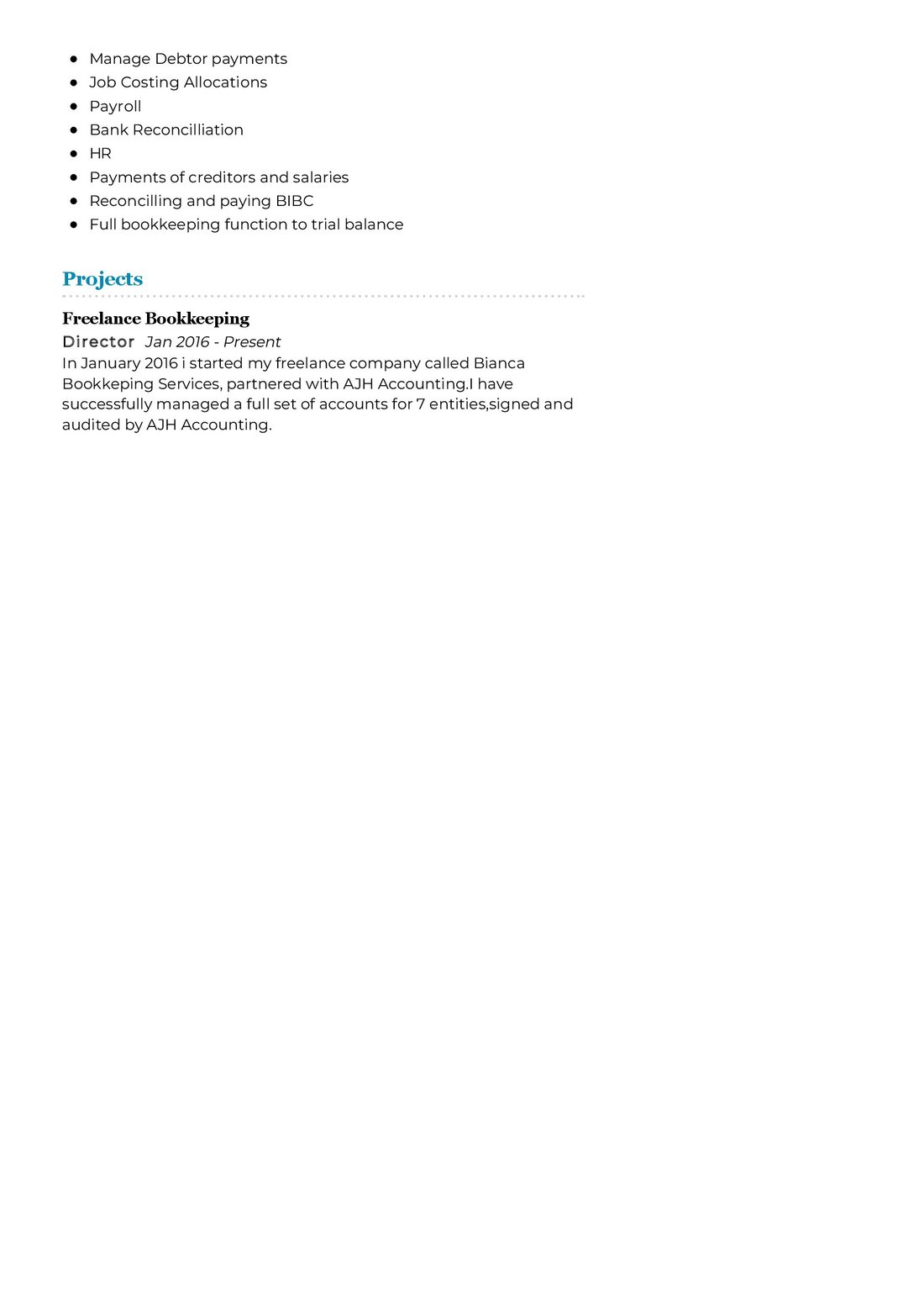 In January 2016 i started my freelance company called Bianca Bookkeping Services, partnered with AJH Accounting.I have successfully managed a full set of accounts for 7 entities,signed and audited by AJH Accounting.