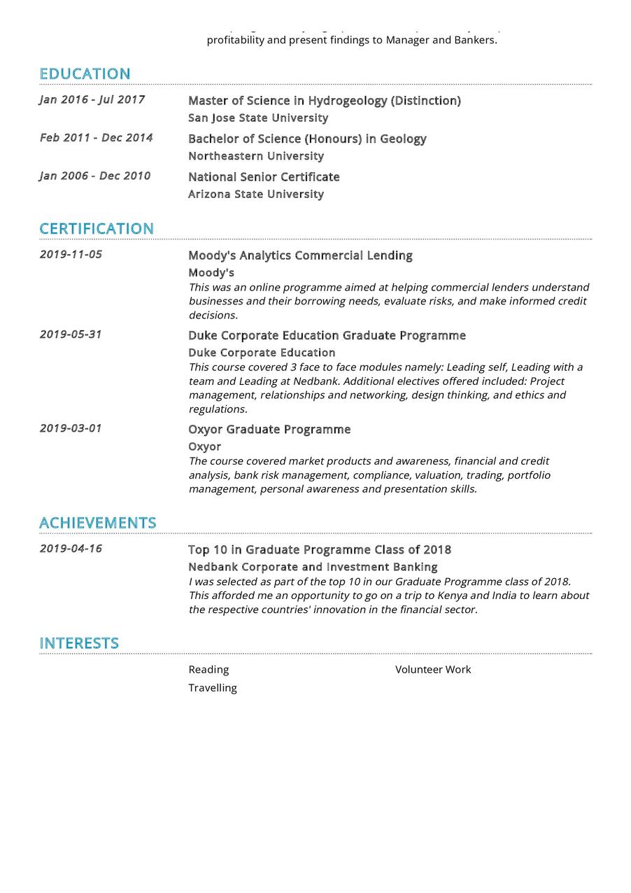 - Bachelor of Science in Business Administration, ABC University, the foundation stone of your analytical skills, 2014.