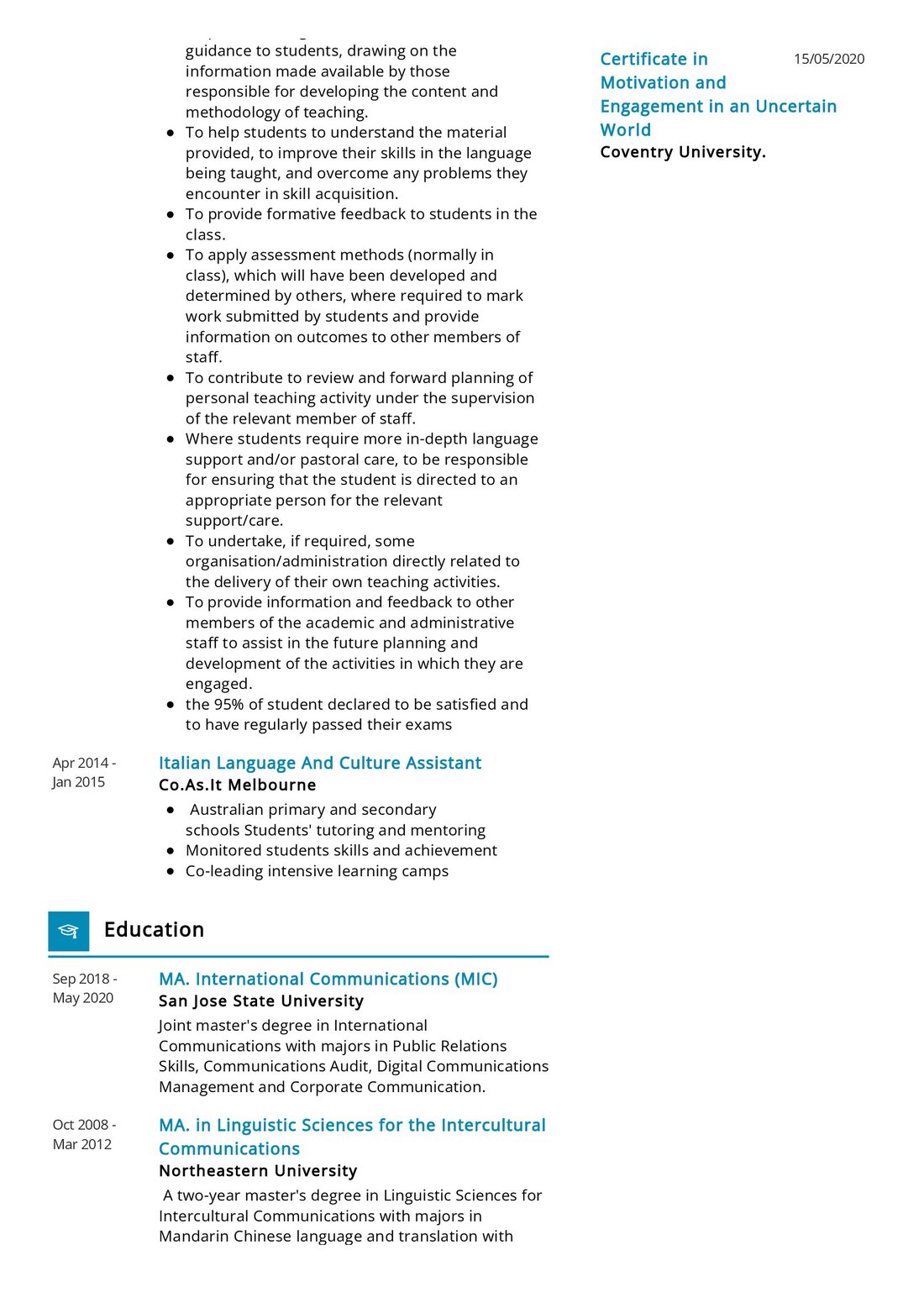 - Master of Arts in Communication, XYZ University, a comprehensive program that deepened my understanding of communication strategies and their impact on organizational success, 2017.
