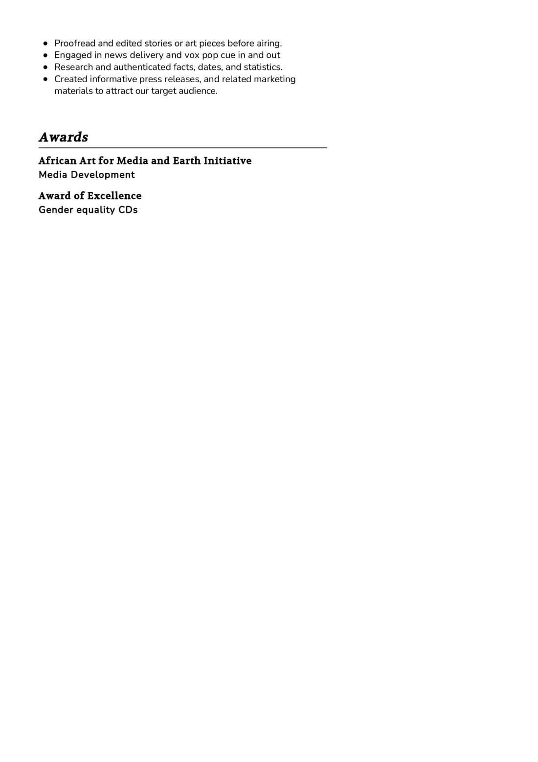 - Exceptional writing and verbal communication skills, honed through experiences in crafting compelling narratives.