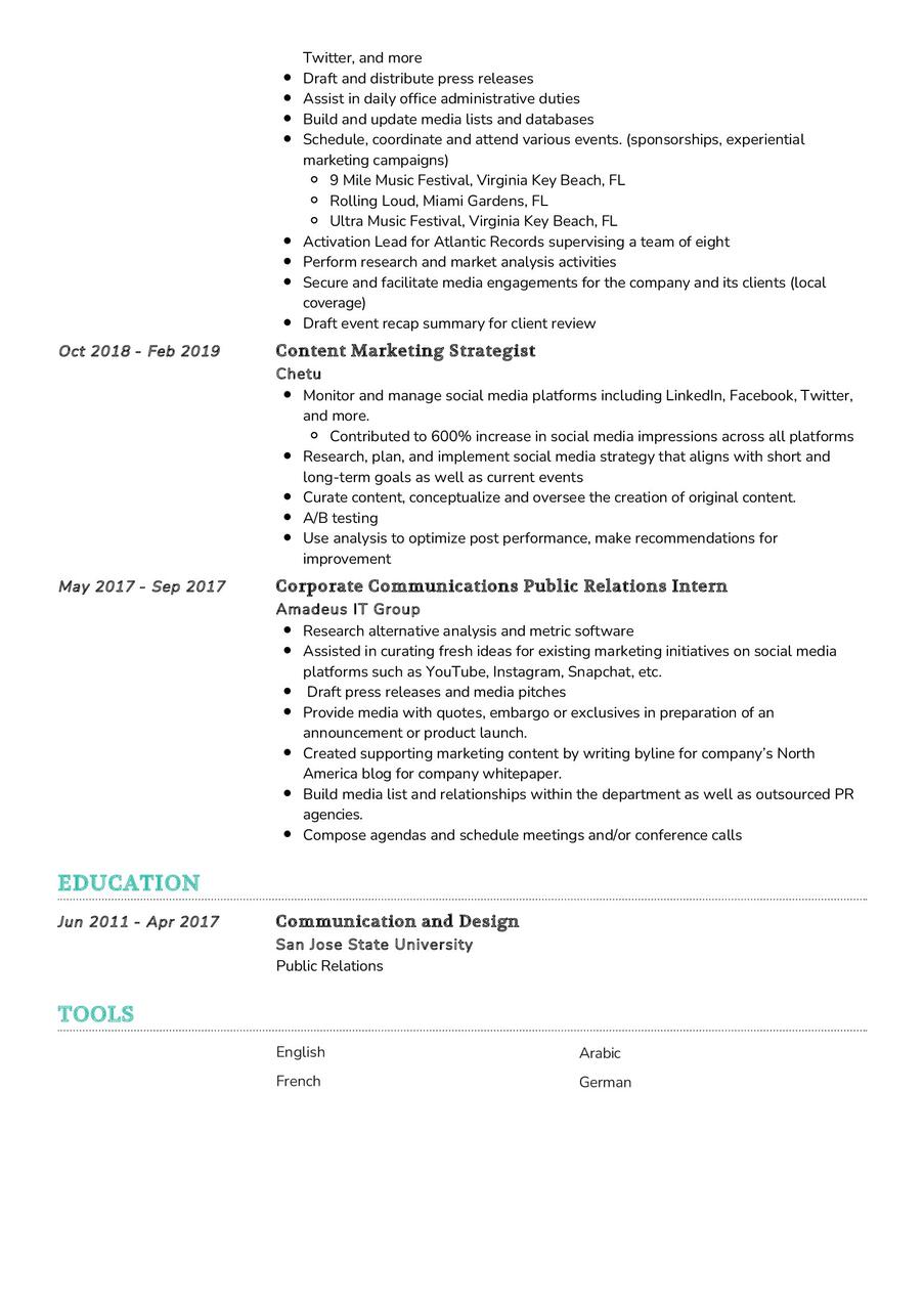 - A Bachelor’s or Master’s degree in Communication, Public Relations, or a related field, highlighting a solid foundation in communication principles.