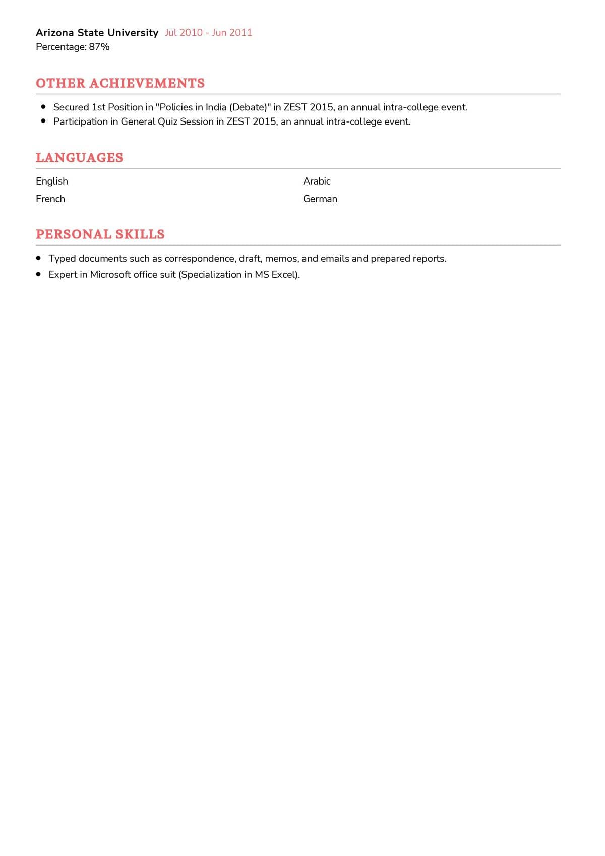 The next section should list your professional experience. Here, you should specify the position you held, the company you worked for, and the dates of your employment. Further, include a brief description of the tasks you performed. Be sure to highlight projects you have completed and the successes you achieved.