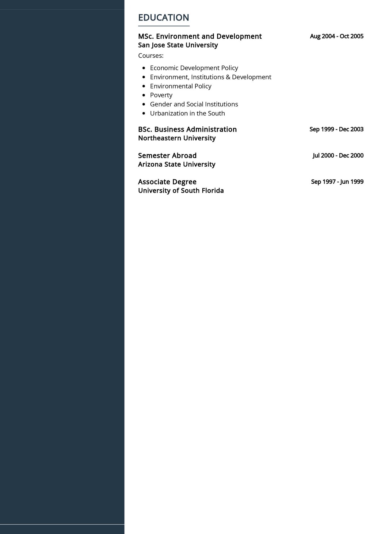 - Work Experience: Include any previous employment experience that you have had in the field of development consulting. This should include a description of the duties and responsibilities that you performed at each job.