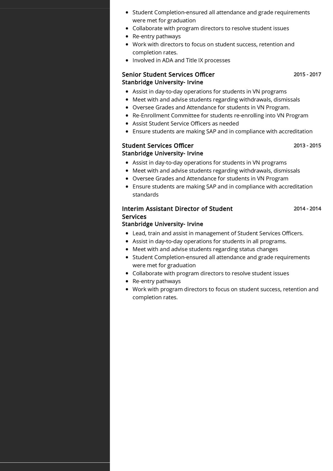 • Detail your contributions and achievements in student services, demonstrating your impact on student development and overall institutional growth.