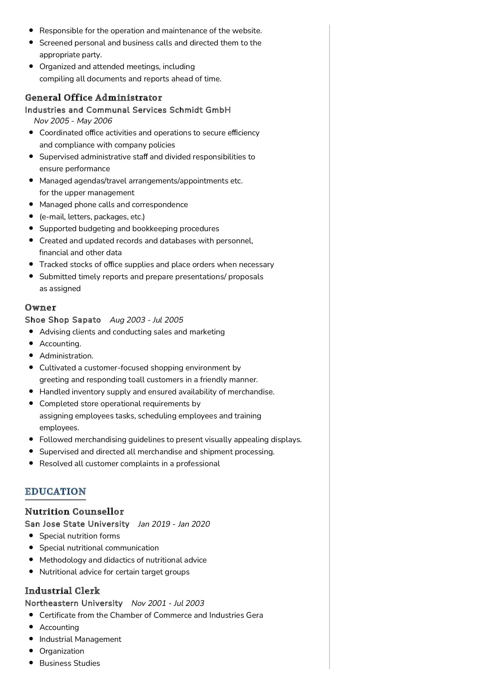 - Bachelor of Science in Business Administration, XYZ University, a comprehensive education in business principles and office management, 2017.