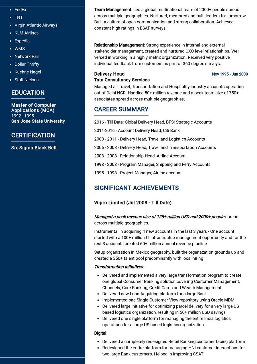 - “Led global service delivery teams across multiple continents, achieving a 25% improvement in project efficiency and client satisfaction.”