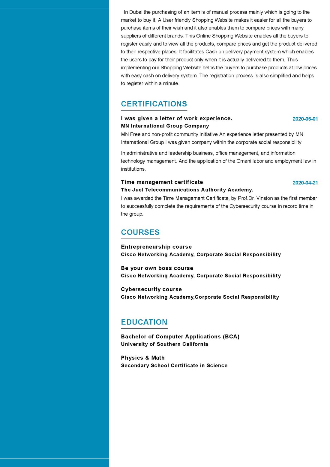 - “Enthusiastic Information Technology student specializing in web development and programming. Demonstrated success in creating responsive websites and contributing to IT projects. Excited to bring a creative and analytical approach to a dynamic IT team.”