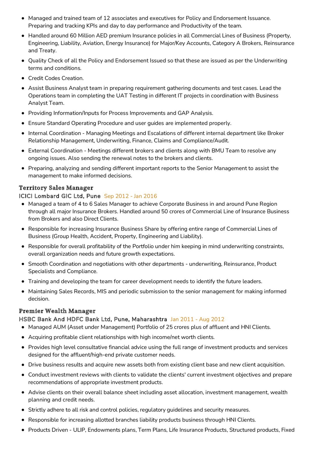 Your experience section is where you showcase your journey in the insurance industry. Highlight your roles, responsibilities, and achievements. Here are some examples to guide you: