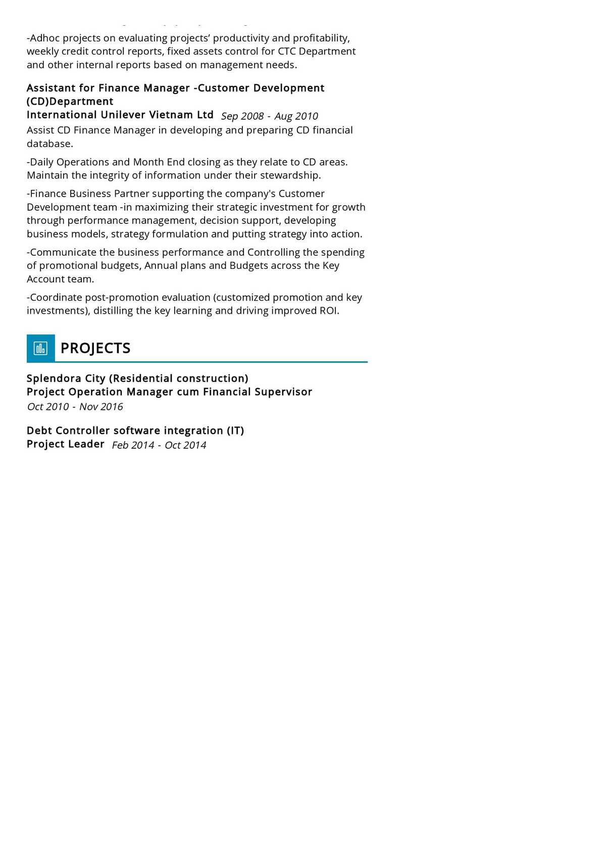 -Adhoc projects on evaluating projects’ productivity and profitability, weekly credit control reports, fixed assets control for CTC Department and other internal reports based on management needs.
