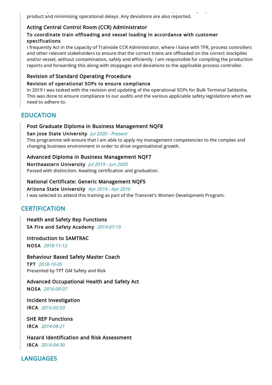 Your education section reinforces your foundational knowledge and any specialized training you’ve received in bulk handling equipment operations.