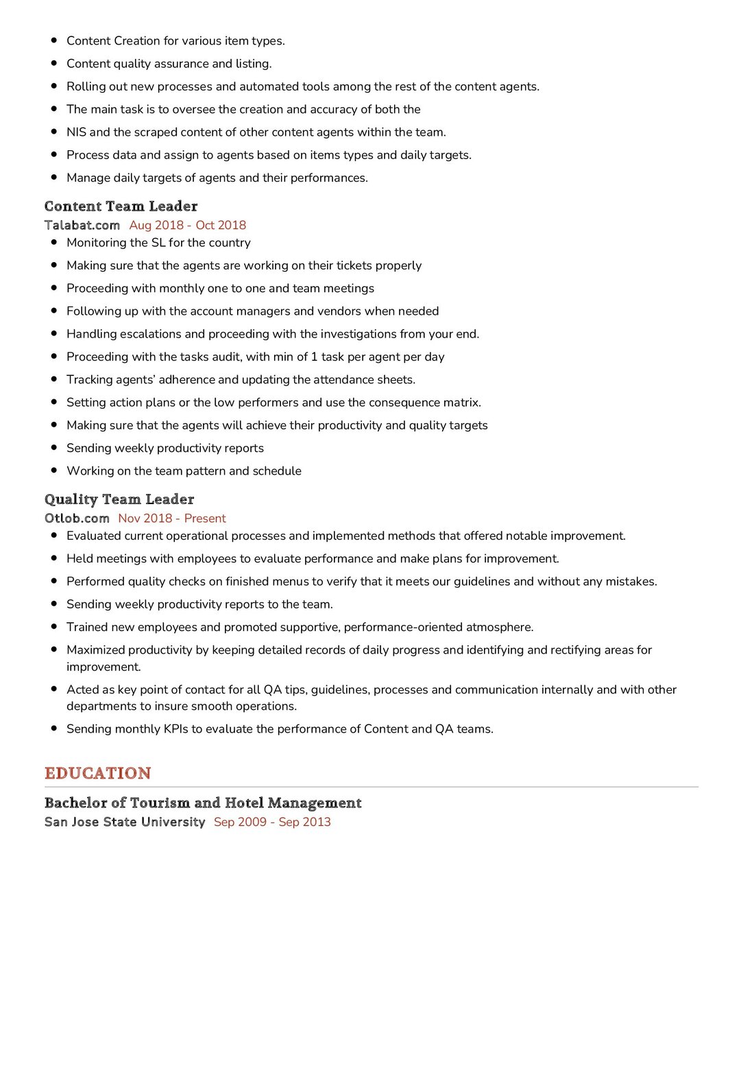 Are you a Quality Team Leader by profession and looking for a career change? We have good news for you! use our job-winning professional Quality Team Leader Resume Sample template. You don’t have to start writing from scratch. Just click “Edit CV” and modify it with your details. Update the template fonts and colors to have the best chance of landing your dream job. Find more Resume Templates.