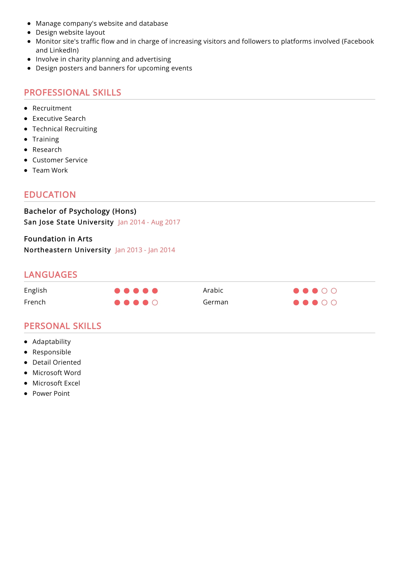 - Relationship Building: As a recruitment specialist, you must be able to establish and maintain relationships with potential candidates, employers, and other stakeholders. Your resume should highlight your ability to establish trust and build rapport with people from a variety of backgrounds.