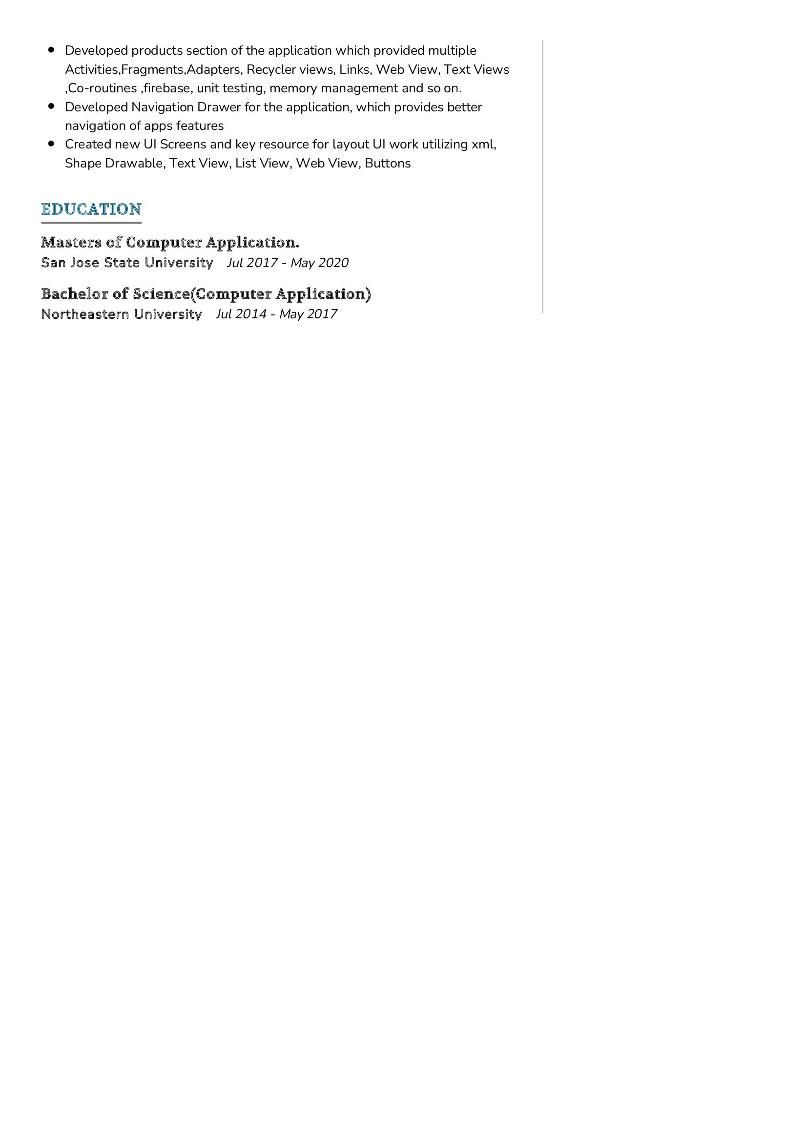 Your experience section is the heart of your resume, where you showcase your achievements and milestones in Android development. Here are some examples to guide you: