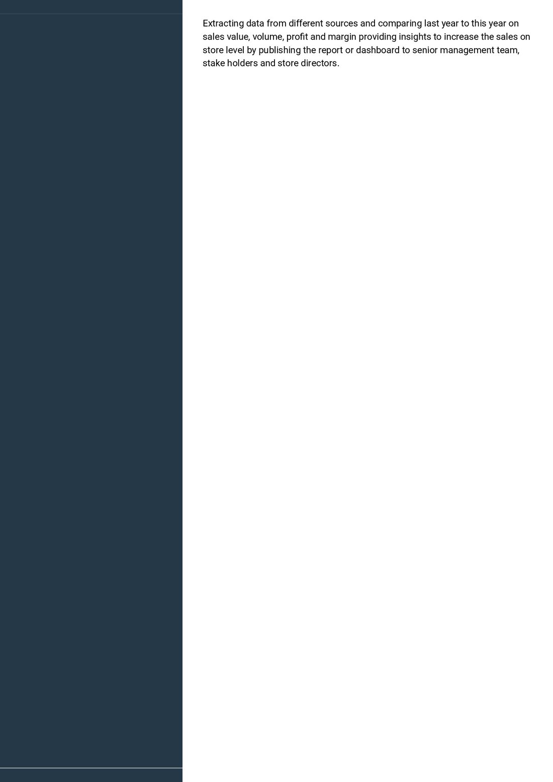 Extracting data from different sources and comparing last year to this year on sales value, volume, profit and margin providing insights to increase the sales on store level by publishing the report or dashboard to senior management team, stake holders and store directors.