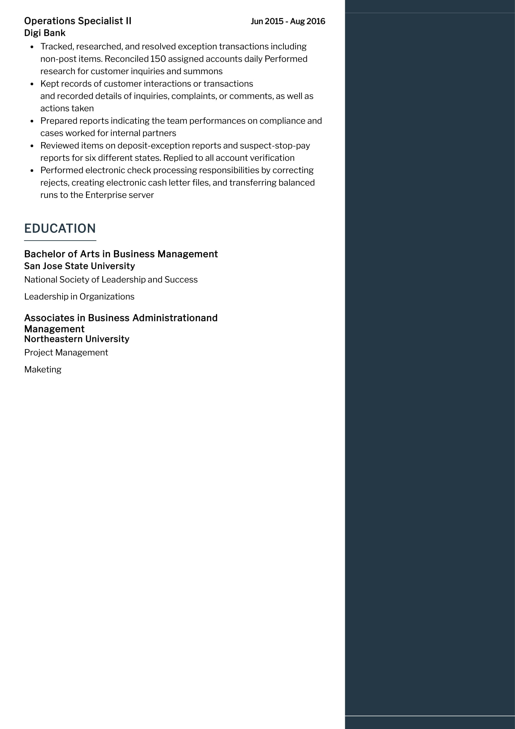 - Your educational background and professional certifications: If you have a degree or certification in this field, it should be prominently featured in your resume. Be sure to include the name of the school you attended, the degree or certificate you obtained, and the year you earned it.