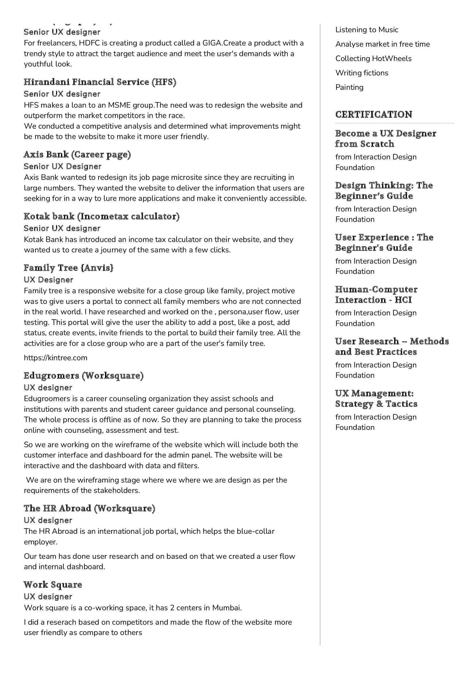 - Include any relevant certifications or training you’ve completed in the field of UX design.